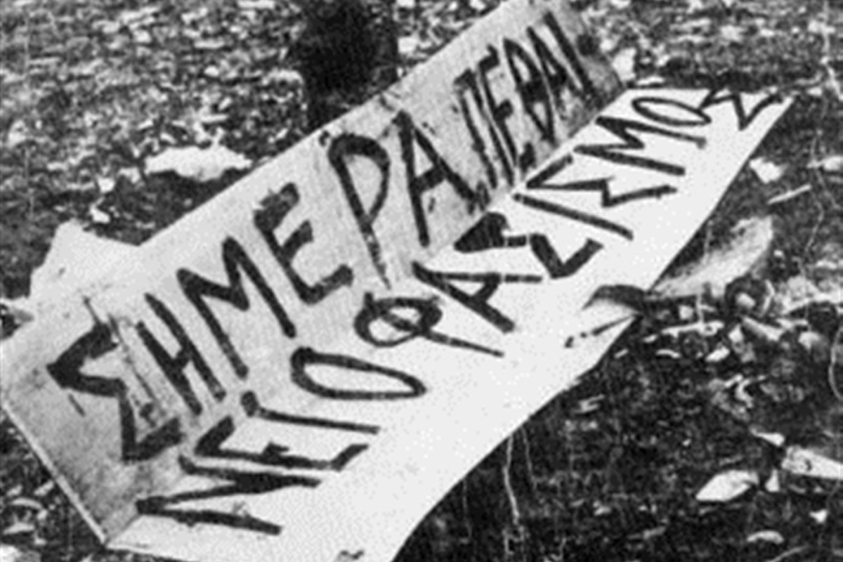 Θα μείνω, λοιπόν, σε ένα σύνθημα που έγραψαν οι φοιτητές την 17η Νοεμβρίου του 1973 και το οποίο έλεγε «σήμερα πεθαίνει ο φασισμός».