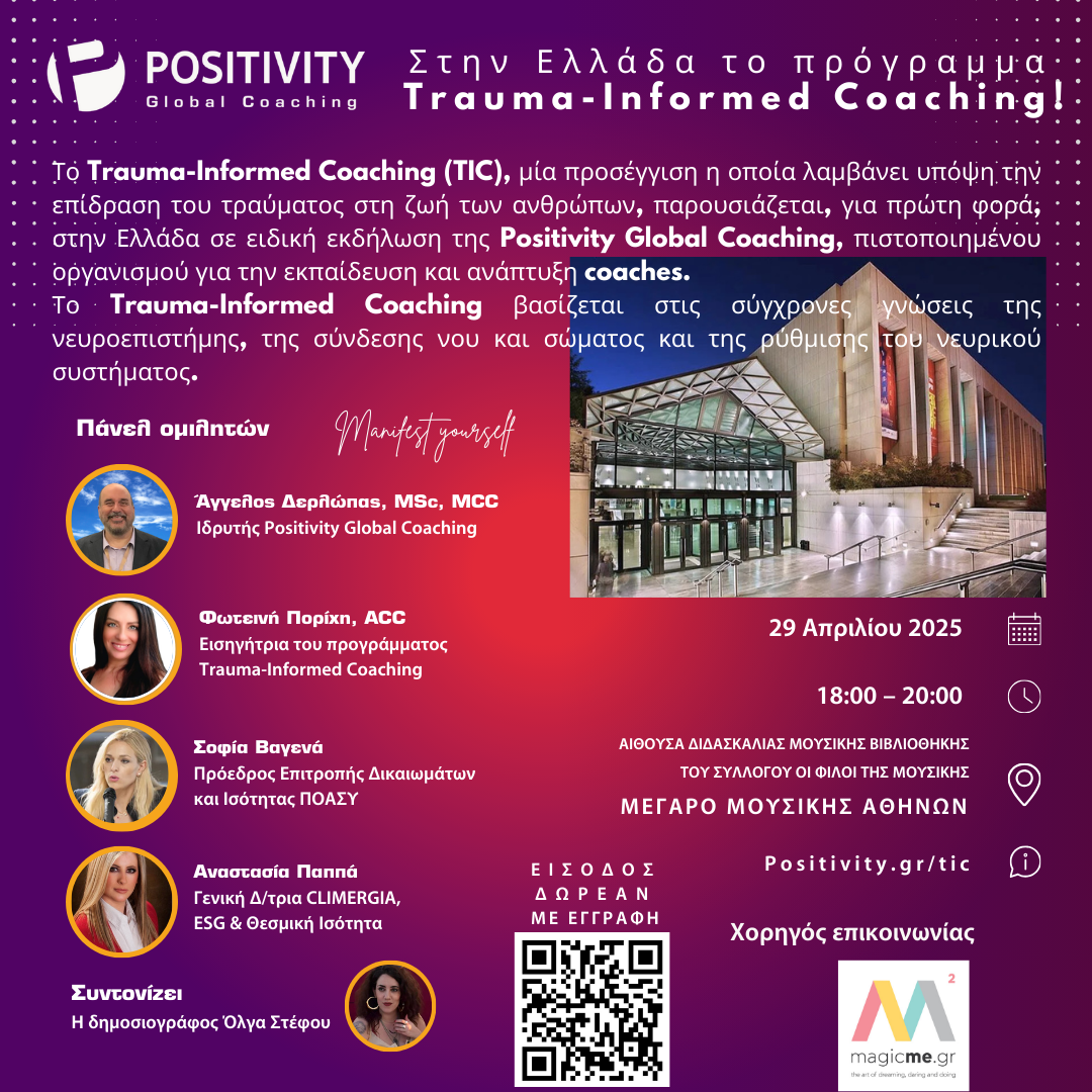 Το Trauma-Informed Coaching (TIC), μια προσέγγιση που λαμβάνει υπόψη την επίδραση του τραύματος στη ζωή των ανθρώπων και δημιουργεί ένα ασφαλές και υποστηρικτικό περιβάλλον για τους πελάτες, παρουσιάζεται για πρώτη φορά στην Ελλάδα στο Μέγαρο Μουσικής Αθηνών από την Positivity Global Coaching, έναν πιστοποιημένο οργανισμό με διεθνή παρουσία στην εκπαίδευση και ανάπτυξη coaches.