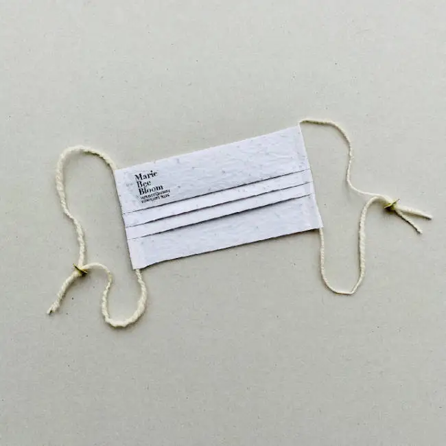 Οι σπόροι λουλουδιών μένουν στη μάσκα με τη χρήση μιας ειδικής κόλλας που είναι φτιαγμένη από νερό και άμυλο πατάτας. Και εκτός από όλα τα άλλα βιώσιμα υλικά από τα οποία είναι φτιαγμένη η βιοδιασπώμενη μάσκα, ακόμα και το logo είναι γραμμένο με ειδικό βιώσιμο μελάνι.